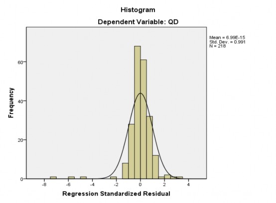 Quan sát biểu đồ tần số phần dư chuẩn hóa Histogram (hình 4.7) cho thấy, giá trị trung bình của các quan sát Mean = xấp xỉ bằng 0 và độ lệch chuẩn Std. Dev = 0,991 (xấp xỉ =1). Vì thế, cho phép kết luận giả định phần dư có phân phối chuẩn không bị vi phạm.