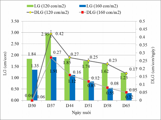 DLG của tôm hệ thống nuôi mật độ 120 con/m2 cao nhất ở ngày nuôi D30 - D37 đạt 0,42 ± 0,01 cm/con/ngày, lớn hơn 1,5 lần so với tôm nuôi ở hệ thống nuôi 160 con/m2 (0,27 ± 0,01 cm/con/ngày) và khác biệt có ý nghĩa thống kê (p<0,05). DLG sau đó giảm dần và thấp nhất ở ngày nuôi D58 - D65 (0,17 ± 0,01 cm/con/ngày) của tôm ở hệ thống nuôi 120 con/m2 nhưng vẫn lớn hơn gấp 3,4 lần so với DLG của tôm nuôi 160 con/m2 (0,05 ± 0,01 cm/con/ngày).