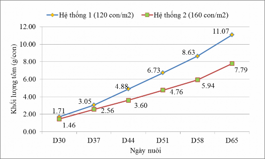 Khối lượng của tôm ở 2 hệ thống trong suốt vụ nuôi đều tăng liên tục từ ngày nuôi D30 cho đến cuối vụ nuôi.