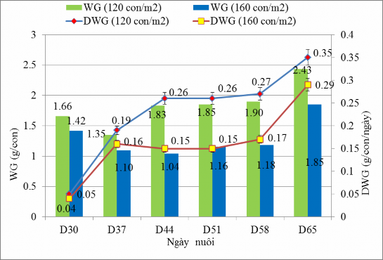 Tốc độ tăng trưởng khối lượng ở ngày nuôi D37 là 1,35 ± 0,11 g/con ở hệ thống nuôi mật độ 120 con/m2 lớn hơn 1,2 lần so với tôm nuôi ở hệ thống 160 con/m2 (1,10 ± 0,01 g/con). Đến ngày nuôi D44 thì tốc độ tăng trưởng khối lượng của tôm trong hệ thống