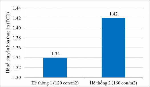 Hệ số chuyển hóa thức ăn của hệ thống nuôi mật độ 120 con/m2 là 1,34 ± 0,01 thấp hơn so với hệ thống nuôi mật độ 160 con/m2 (1,42 ± 0,05) và khác biêṭ có ý nghĩa thống kê (p<0,05). Hệ số chuyển hóa ở hệ thống 1 thấp hơn 1,05 lần so với hệ thống 2.