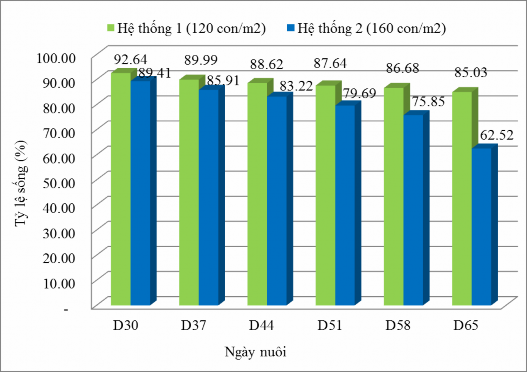 Tỷ lệ sống ở hai hệ thống nuôi trong những ngày nuôi đầu tuy có sự chênh lệch nhưng không lớn, nhưng từ ngày nuôi D37 trở về sau thì có sự chênh lệch lớn giữa hệ thống 1 và 2.(Hình 4.6)