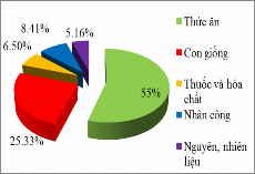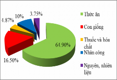 Tỷ lệ các khoảng chi phí biến đổi như: thứ c ăn, thuốc hóa chất, con giống, nguyên nhiên liêu, nhân công ở 2 hệ thống nuôi tương đối cao (Hình 4.7). Trong các khoảng chi phí biến đổi thì chi phí về thứ c ăn chiếm tỷ lê ̣cao nhất (chiếm 64,9%). Chi phí thức ăn ở hệ thống nuôi 120 con/m2, cao hơn khoảng 10% so với hệ thống nuôi mật độ 160