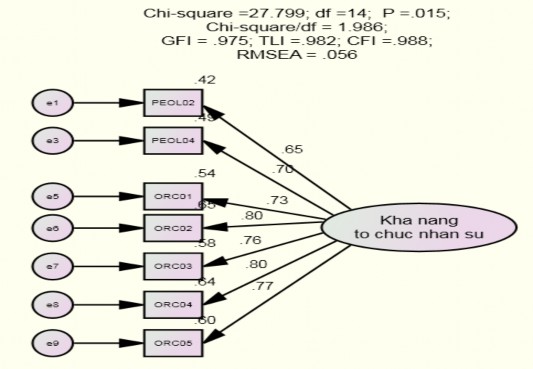 Tất cả các ước lượng chuẩn hoá về hệ số tải nhân tố (chuẩn hoá) đều có giá trị cao, giao động từ 0.580 đến 0.83. Kiểm tra chỉ số điều chỉnh cho thấy độ phù hợp có thể được cải thiện đáng kể nếu như giải phóng mối quan hệ hiệp phương sai của các cặp sai số giữa các biến quan sát PEOL03 với PEOL02, PEOL03 với ORC02. Kết quả tương tự đối các cặp quan sát PEOL05 với ORC01, PEOL05 với PEOL02, PEOL05 với ORC04. Điều này cho thấy các sai số đo lường nhiều hơn đại diện của chúng trong biến quan sát của thang đo (Arbuckle, 2008).