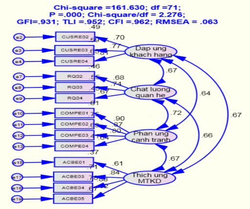Tất cả các ước lượng chuẩn hoá về hệ số tải nhân tố (chuẩn hoá) đều có giá trị cao, giao động từ 0.657 đến 0.872. Kiểm tra chỉ số điều chỉnh cho thấy độ phù hợp có thể được cải thiện đáng kể nếu như giải phóng mối quan hệ hiệp phương sai của các cặp sai số giữa các biến quan sát CUSRE01 với CUSRE02, CUSRE01 với COMPRE04, CUSRE01 với ACBE01. Kết quả tương tự đối các cặp quan sát COMPRE05 với COMPRE04, COMPRE05 với COMPRE02, COMPRE05 với