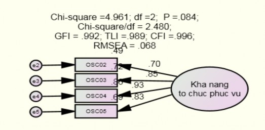 Thang đo khả năng tổ chức phục vụ của ngân hàng thương mại được giả thuyết là thang đo đơn hướng bao gồm 5 biến quan sát từ OSC01 đến OSC05. Tuy nhiên, kết quả EFA trong nghiên cứu sơ bộ đã loại biến quan sát OSC01 vì có hệ số tải nhân tố thấp (<0.5). Do vậy khi phân tích CFA thang đo này chỉ bao gồm 4 biến quan sát từ OSC02 đến OSC05.