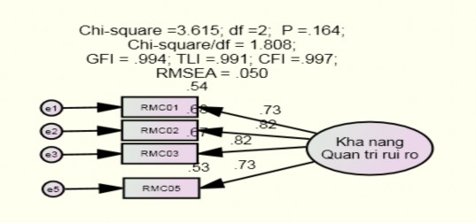 Khả năng quản trị rủi ro của ngân hàng thương mại được giả thuyết là thang đo đơn hướng bao gồm 5 biến quan sát từ RMC01 đến RMC05. Kết quả CFA ban đầu cho thấy mô hình có 5 bậc tự do với Chi-square=22.385, các chỉ số CMIN/df=4.477 (>3.0) và RMSEA=0.105 (>0.08) chưa thoả mãn đi ều kiện về sự phù hợp của mô hình (Hair & ctg, 2010) mặc dù các chỉ số GFI, TLI, CFI đều lớn hơn 0.90. Do vậy,