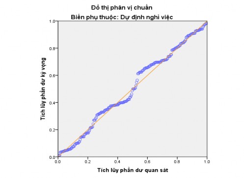 Phần dư chuẩn hóa có phân phối chuẩn với độ lệch chuẩn bằng 0.983 (hình 4.2) và các điểm quan sát trong đồ thị phân vị chuẩn (P-P Plot) phân tán không quá xa đường thẳng kỳ vọng (hình 4.3) nên giả định phân phối chuẩn của phần dư chuẩn hoat đạt yêu cầu.
