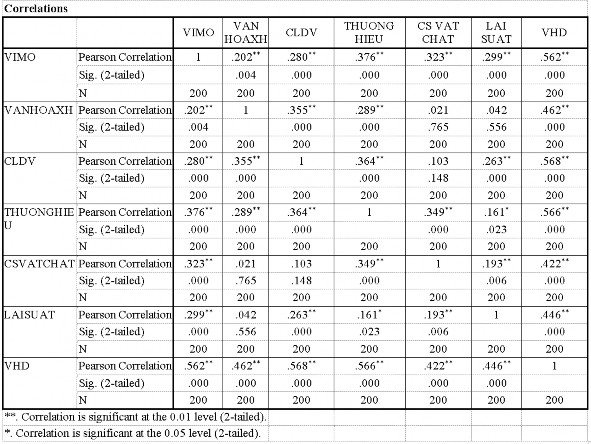 (Nguồn: Phụ lục 4) Theo kết quả phân tích tương quan Pearson ở trên, các biến độc lập VIMO, CLDV, VANHOAXH, THUONGHIEU, CSVATCHAT, LAISUAT đều có tương