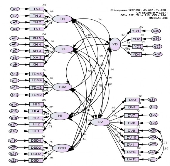 = 0.827; TLI = 0.915 (> 0.9) ; CFI=0.924 (> 0.9 ); RMSEA=0.063 (<0.08).