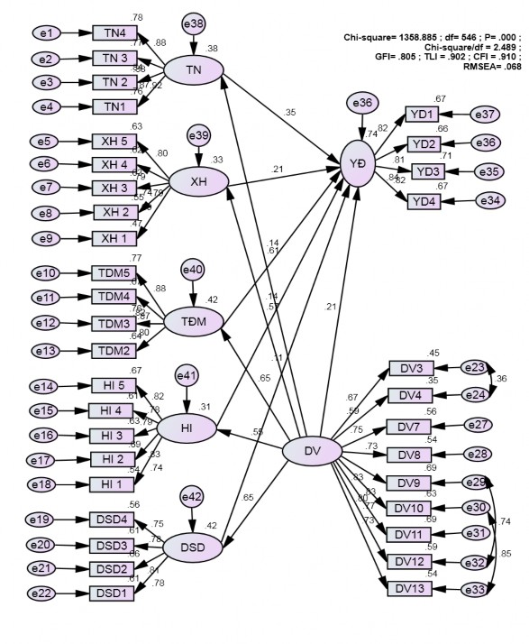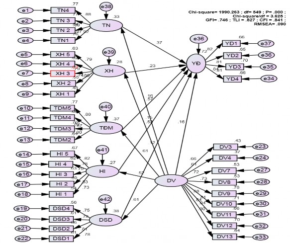 Các hệ số trong mô hình có hệ số Chi-square/df = 3.625 (>3); GFI = 0.746; TLI = 0.827 (<0.09) ; CFI=0.841 (< 0.09); RMSEA=0.090 (>0.08) cho thấy mô hình