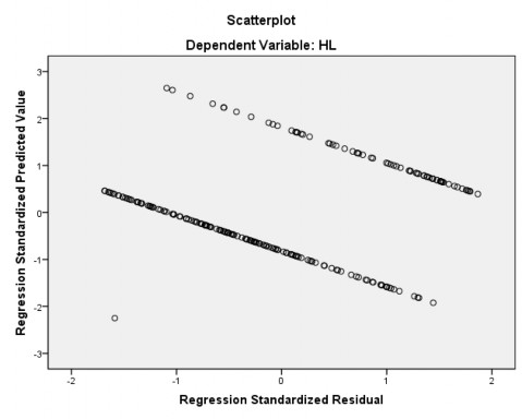 Đồ thị phân tán phần dư chuẩn hóa cho thấy các phần dư được phân tán ngẫu nhiên trong một vùng xung quanh đường hoành độ 0 (Standardized Residual ở trục hoành) mà không tuân theo bất kỳ một quy luật hình dạng nào. Vì thế, cho phép kết luận giả định liên hệ tuyến tính ko vi phạm.