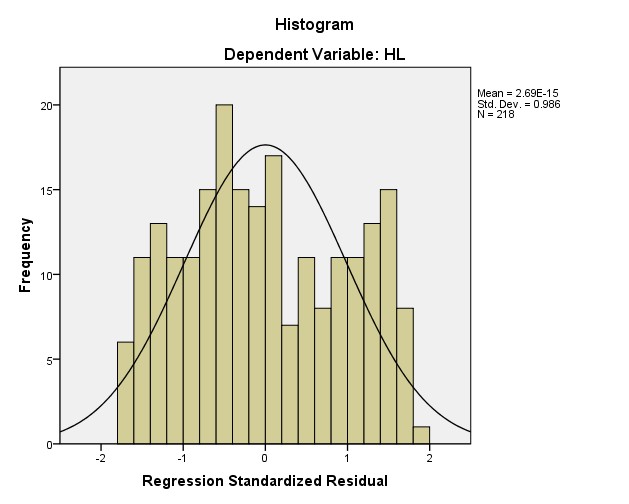 Phần dư có thể không tuân theo phân phối chuẩn vì những lý do như: sử dụng sai mô hình, phương sai không phải là hằng số, số lượng các phần dư không đủ nhiều để phân tích... Vì vậy, chúng ta cần thực hiện nhiều cách khảo sát khác nhau. Một cách khảo sát đơn giản nhất là xây dựng biểu đồ tần số của các phần dư Histogram. Theo hình 4.6 cho thấy giá trị trung bình của các quan sát (Mean) xấp xỉ bằng 0 và độ lệch chuẩn (Std.Dev): 0.986 (xấp xỉ 1), vì thế phân phối phần dư xấp xỉ chuẩn. Do đó, có thể kết luận rằng: Giả thiết phân phối chuẩn của phần dư không bị vi phạm.