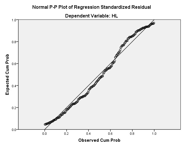 Căn cứ vào Đồ thị P-P Plot của phần dư đã được chuẩn hóa cho thấy các điểm thực tế phân tán rất gần đường thẳng kỳ vọng cho thấy giả thuyết phân phối chuẩn của phần dư không bị vi phạm.