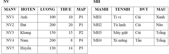 NV(MANV, HOTEN, LUONG, THUE, MAP): Lưu các thông tin về nhân viên PH(MAP, TENP, MIEN, MAQL): Lưu thông tin về phòng