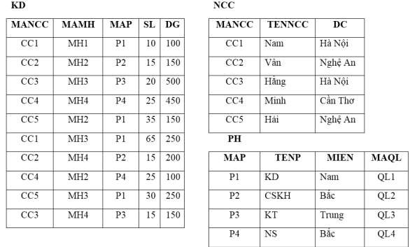 KD(MANCC, MAMH, MAP, SL, DG): Lưu thông tin về quá trình kinh doanh Trong đó: MANV-Mã nhân viên, HOTEN-Họ tên, LUONG-Lương của nhân viên,
