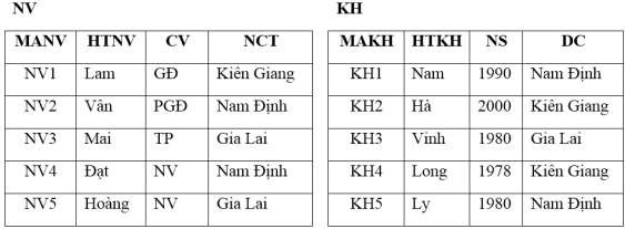 NV(MANV, HTNV, CV, NCT): Lưu thông tin về về nhân viên của công ty KH(MAKH, HTKH, NS, DC): Lưu thông tin về các khách hàng đã mua bảo hiểm của công ty