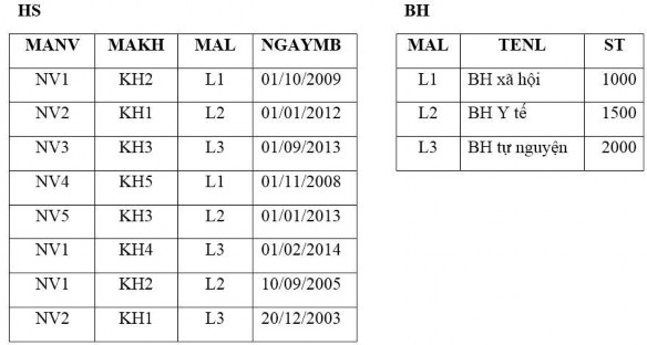 HS(MANV, MAKH, MAL, NGAYMB): Lưu thông tin về việc mua bán bảo hiểm Trong đó: MANV-Mã nhân viên, HTNV-Họ tên nhân viên, CV-Chức vụ, NCT-Nơi công tác của nhân viên, MAKH-Mã khách hàng, HTKH-Họ tên khách hàng, NS- Năm sinh của khách hàng, DC-Địa chỉ của khách hàng, MAL-Mã loại bảo hiểm, TENL- Tên loại bảo hiểm, ST-Số tiền của loại bảo hiểm, NGAYMB-Ngày mua bán.