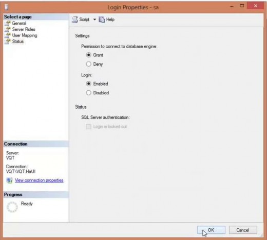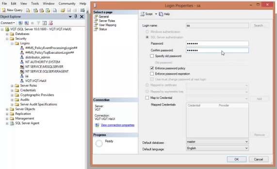 Bước 3: Cấu hình đăng nhập tài khoản sa trong SQL Server trên cả hai máy