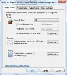 Bước 3: Tại Tab Domain Profile, Private Profile, Public Profile chọn Firewall state là Off.