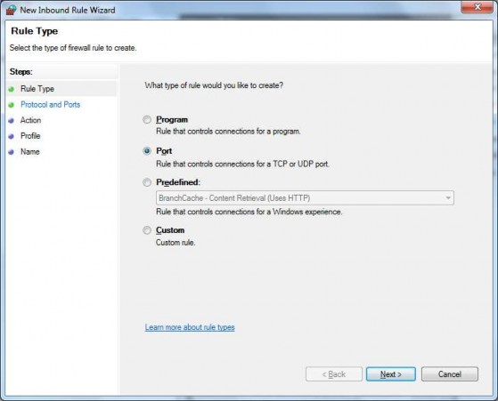 - Chọn Inbound Rule/New Rule/Chọn Port/Next