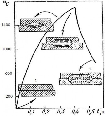 1.16. Trên đồ thị vị trí 1 là lúc tiếp xúc nguội, vị trí 2 mặt tiếp xúc nóng chảy dần, vị trí 3 tạo thành điểm hàn và vị trí 4 mối hàn đông đặc và nguội lạnh.