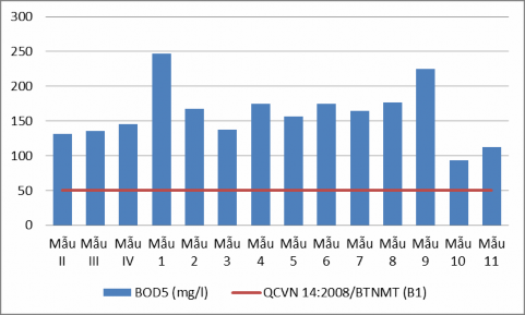 - Về hàm lượng BOD5 14/14 mẫu đều vượt QCVN 14:2008/BTNMT. Cao nhất là mẫu nước thải sinh hoạt thải khu Phú Thanh Tây, phường Yên Thanh là 247,3 (mg/l) vượt gần 5 lần so với quy chuẩn. Các mẫu khác vượt từ 3 đến 4 lần giới hạn cho phép.