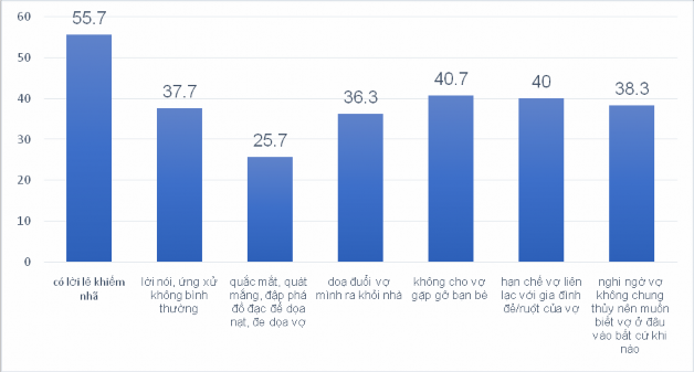 Thực trạng bạo lực gia đình được đánh giá thông qua thông tin do những nam giới tham gia khảo sát cung cấp. Nghiên cứu đã đưa ra câu hỏi để đánh gía thực trạng hành vi bạo lực của người trả lời với vợ của mình trong vòng 12 tháng qua bằng cách liệt kê các hành vi và nam giới có thể lựa chọn nhiều phương án. Nghiên cứu đo theo từng hành vi bạo lực, trong đó mỗi hành vi bạo lực có thể thuộc vào mấy loại hình bạo lực khác nhau. Do đó tổng tỷ lệ của 4 nhóm bạo lực không bằng 100%. Phân tích câu trả lời của nam giới lựa chọn, kết quả cho thấy tình trạng bạo lực của nam giới diễn ra trên cả 4 nhóm bạo lực với đa dạng các hành vi khác nhau, trong đó hành vi bạo lực tinh thần là dạng bạo lực nam giới sử dụng nhiều nhất sau đó đến bạo lực kinh tế, bạo lực thể xác và ít nhất là hành vi bạo lực tình dục thông qua quan sát biểu đồ 3.1 dưới đây.