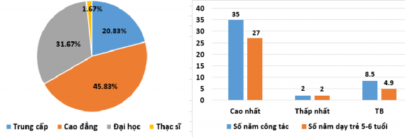 Kết quả khảo sát thực trạng giáo dục TTN dựa trên QTE cho trẻ 5-6 tuổi ở trường mầm non được xác định dựa trên phân tích, thống kê các ý kiến của 120 GVMN đã có kinh nghiệm dạy lớp 5 tuổi ít nhất 2 năm, tại các trường mầm non ở Hà Nội, Nam Định. Trong đó, giáo viên có số năm kinh nghiệm nhiều nhất là 35 năm, số năm kinh nghiệm ít nhất là 2; số năm dạy trẻ mẫu giáo 5-6 tuổi nhiều nhất là 27 năm, số năm dạy trẻ 5-6 tuổi ít nhất là 2. Số lượng giáo viên có trình độ thạc sĩ là 2, trình độ đại học là 36, trình độ cao đẳng là 42, trình độ trung cấp là 40, xem biểu đồ dưới đây: