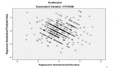 Đối với giả định liên hệ tuyến tính. Phương pháp được sử dụng là biểu đồ Scatterplot với giá trị phần dư chuẩn hoá trên trục tung và giá trị dự đoán chuẩn hoá trên trục hoành. Nhìn vào biểu đổ ta thấy phần dư không thay đổi theo một trật tự nào đối với giá trị dự đoán. Vậy giả thuyết về liên hệ tuyến tính không bị vi phạm.
