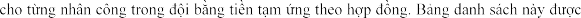 Đội trưởng mỗi đội thi công chịu trách nhiệm lập danh sách công nhân, chấm công cho từng công nhân trong đội gửi cho Ban chỉ huy công trình. Tuỳ theo bậc thợ mà đơn giá của từng công nhân sẽ khác nhau. Đội trưởng sẽ thanh toán lương