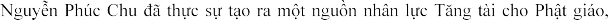Công lao phát triển Phật pháp sâu rộng ở Đàng Trong thuộc về chúa Nguyễn Phúc Chu, pháp danh Hưng Long, hiệu Thiên túng đạo nhân, trong thời gian 34 năm trị vì, chúa là người tạo nhiều công đức lớn trong việc phát triển Phật giáo Đàng trong. Các nhà sư danh tiếng của Trung Hoa đã đến xứ Đàng Trong hoằng pháp và được chúa tạo điều kiện xây dựng chùa chiền và tôn vinh ban hiệu. Ngài Viên Cảnh, Viên Khoan, thiền sư Nguyên Thiều lập chùa Thập Tháp Bình Định, chùa Quốc Ân Huế, thiền sư Từ Lâm dựng chùa Từ Lâm ở Huế năm 1697, thiền sư Tử Dung khai sơn chùa Ân Tôn (tức chùa Từ Đàm ở Huế) vào năm 1703, Thiền sư Liễu Quán quê ở tỉnh Phú Yên, khai sơn chùa Thuyền Tôn (Huế) và cũng là người có công lớn trong việc Việt hóa thiền phái Lâm Tế ở Đàng Trong. Dấu ấn lớn của chúa là ngoài việc thỉnh thiền sư Đại Sán Trung Hoa sang để tổ chức Giới đàn, thọ Bồ tát giới, còn cho trùng tu chùa Thiền Lâm, xây dựng thêm nhiều công trình ở chùa Thiên mụ, đúc quả chuông đồng lớn nhất nặng 3285 cân tại chùa này để phụng thờ Tam Bảo, mà ngày nay chúng ta có thể đọc phần ghi công đức tạo dựng chuông: “ Đại Việt quốc chúa Nguyễn Phúc Chu tự Động thượng chính tông tam thập đại, pháp danh Hưng Long, chú tạo hồng chung (trọng tam thiên nhị bách bát thập ngũ cân) nhập vu ngự kiến Thiên Mụ thiền tự, vĩnh viễn cung phụng Tam bảo” (Tạm dịch: Chúa nước Đại Việt Nguyễn Phúc Chu, nối dòng Tào động, đời thứ 30, pháp danh là Hưng Long, đúc quả chuông lớn này (nặng 3285 cân) an trí ở chùa Thiên Mụ để mãi mãi cung phụng Tam bảo) [8; 22].