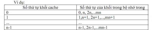 Như vậy, trong kiểu xếp đặt khối này, mỗi vị trí đặt khối trong cache có thể chứa một trong các khối trong bộ nhớ cách nhau xn khối (x: 0,1,...,m; n: số khối của cache).