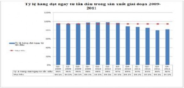 Nhìn chung tỷ lệ hàng đạt chất lượng ngay từ lần đầu sản xuất của công ty khá cao. Từ Q 1/2009- đến Q3/2010, sản xuất luôn đạt và vượt mục tiêu. Tuy nhiên, từ Q4/2010 đến Q4/2011 tình hình sản xuất của công ty bị sụt giảm kéo theo một loạt ảnh hưởng đến các tiêu sản xuất và chi phí như chi phí sản xuất tăng, tỷ lệ hàng hủy tăng,