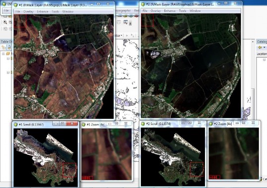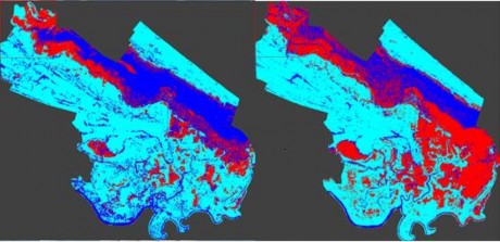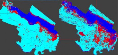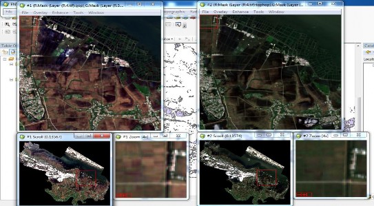 Để phát hiện chính xác những điểm ảnh ngập lụt thì điều cần thiết phải tách được những điểm ảnh này ra từ những điểm ảnh được xác định liên quan đến nước. Vì vậy, việc xác định những điểm ảnh liên quan đến nước là cần thiết và trở thành cơ sở trong quá trình phân loại các đối tượng. Đối tượng chủ yếu cần được phân loại trong nghiên cứu là những điểm ảnh liên quan đến nước, vì vậy, 2 đối tượng chính cần được phân loại là những điểm ảnh ngập nước (sông, khu vực nuôi trồng thủy sản, ruộng lúa, nước chảy tràn do lũ đổ về và những khu vực bị ngập do mưa) và những điểm ảnh không ngập (rừng, đồi núi, đất trống ở khu vực cao). Khu vực nghiên cứu thể hiện trên ảnh được phân loại thành 2 đối tượng, phần diện tích màu đỏ là kết quả của quá trình phân loại kết hợp các chỉ số −1