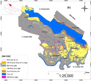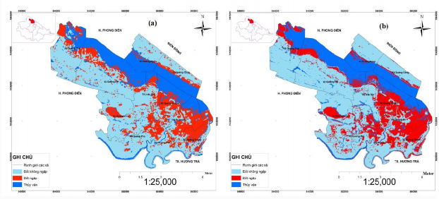 Hình 3.4. Sơ đồ phân vùng ngập lụt huyện Quảng Điền từ ảnh viễn thám: (a) Năm 2017 và (b) Năm 2019 (Hình ảnh thu nhỏ từ bản đồ phân vùng ngập tỷ lệ 1:25.000)