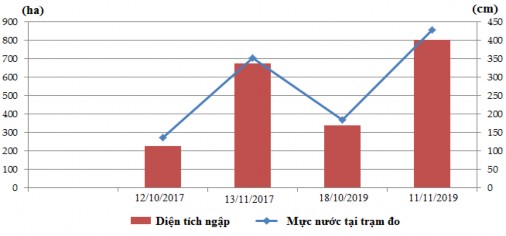 Qua hình 3.5 cho thấy, mực nước đo được tại các giai đoạn ngập lụt trong năm 2017 và 2019 dao động từ hơn 130 cm đến hơn 400 cm. Trong khi đó, diện tích đất bị ngập dao động từ hơn 200 ha đến hơn 900 ha từ tháng 10 đến tháng 11 năm 2017 và năm 2019. Kết quả so sánh cho thấy, sự tương thích giữa hai bộ dữ liệu, đó là diện tích ngập được xác định từ ảnh viễn thám cũng dao động theo hướng tăng dần cùng với mực nước đo tại trạm đo Phú Ốc (sông Bồ). Điều này cho thấy, giữa diện tích ngập lụt và mực nước đo được tại trạm Phú Ốc, có một mối tương quan chặt chẽ. Do đó, mực nước càng cao thì diện tích ngập lụt ở huyện Quảng Điền càng lớn. Qua việc tham vấn người dân và cán bộ ở huyện Quảng Điền cũng như đi thực địa trong đợt lũ lụt diễn ra vào tháng 11 năm 2019 cho thấy kết quả nghiên cứu ở trên đã phản ánh đúng thực tế tại địa phương.