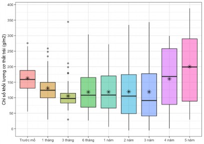 Nhận xét: Trước phẫu thuật, chỉ số khối lượng cơ thất trái trung bình là 162,9 (bình thường là 100,77g/m2). Sau mổ 1 tháng, chỉ số này là 130,5g/m2, sau 3 tháng giảm còn 105,4 g/m2. Tuy nhiên, sau 6 tháng, chỉ số này tăng lại, trung bình là 118,1g/m2 và giữ ổn định ở mức cao.