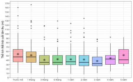 Nhận xét: Thể tích thất trái cuối tâm thu bình thường sau khi thất trái bóp, lượng máu còn lại trong thất trái là 60ml. Trước phẫu thuật, thể tích này là 53,9ml; sau phẫu thuật 1 tháng trở đi, thể tích này giảm, giữ trung bình ổn định là 40,6ml.