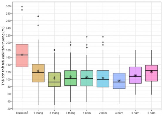 Nhận xét: Trước phẫu thuật, thể tích thất trái cuối tâm trương trung bình là 167,1ml. Sau phẫu thuật, thể tích này được cải thiện rò giảm còn 122,6ml sau 1 tháng là 103,7ml và giữ ổn định về sau.