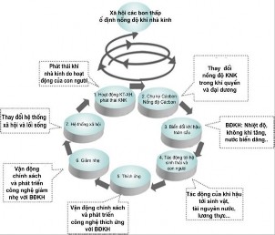 BĐKH, tác động và ứng phó với nó là một quá trình phức tạp và được chia thành 7 pha kế tiếp nhau bao gồm: i) Pha 1: Hoạt động KT - XH và phát thải KNK; Pha 2: Chu kỳ cácbon và nồng độ KNK trong khí quyển; Pha 3: Sự ấm lên toàn cầu/BĐKH; Pha 4: Tác động của BĐKH tới các hệ sinh thái (HST) và xã hội; Pha 5: Thích ứng với BĐKH; Pha 6: Giảm nhẹ BĐKH; và Pha 7: Thay đổi hệ thống xã hội và lối sống [IPCC, 2007, 2011].