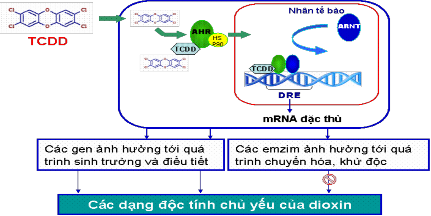 Bên cạnh đó, khi tồn tại trong tế bào động vật dioxin còn có khả năng tạo phức với các AhR (Aryl nuclear Translocator) để tạo nên phức dioxin - AhR - tARN (ARN thông tin) [13], [25]. Phức này càng bền thì độ độc của đồng phân dioxin đó càng cao, phức hợp này có khả năng kết hợp với các protein vận chuyển để xâm nhập vào nhân tế bào tại đây dioxin sẽ tự động can thiệp vào quá trình đóng mở một số gen giải độc quan trọng của tế bào. Khi tồn tại trong nhân tế bào, dioxin sẽ tác động lên các gen quy định cấu trúc của phân tử protein trên phân tử ADN. Sự tác động đó sẽ làm rối loạn quá trình sinh tổng hợp và thay đổi cấu trúc của một số protein quan trọng như: Protein sửa chữa lỗi sai trong quá trình tự sao tổng hợp nên các phân tử ADN mới, các protein đóng vai trò điều chỉnh quá trình sinh trưởng và phát triển của tế bào, emzim tham gia chuyển hóa các độc tố dẫn đến khả năng gây đột biến gen và ung thư của các độc tố khác có trong môi trường [22].