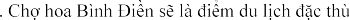 Khu kinh doanh hoa tươi tại Chợ đầu mối nông sản thực phẩm Bình Điền (quận 8, TPHCM) là khu chợ hoa lớn tại thành phố Hồ Chí Minh nơi đây chỉ bán sỉ với mặt hàng chủ lực là các loài hoa có ngồn gốc từ Đà Lạt và một số hoa ngoại nhập. Chợ hoa Bình điền không chỉ đơn thuần kinh doanh hoa mà còn được đầu tư là điểm du lịch thu hút khách với những lợi thế sẵn có . Khu thương mại Bình Điền với cảnh quan sông nước thoáng mát, cách trung tâm thành phố 15 km, thuận lợi cả giao thông đường bộ và đường thủy, rất phù hợp cho việc tổ chức tham quan du lịch. Ngoài ra, tham quan hoạt động mua bán tại chợ là nhu cầu thường được ghép trong các tour du lịch nhằm giúp du khách có điều kiện tìm hiểu rõ địa phương mà họ ![]()