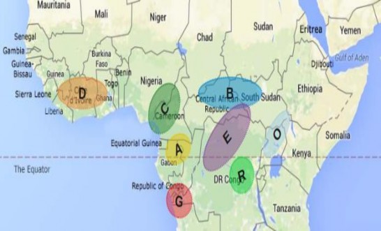 Hình 1.1. Phân bố địa lý của 8 nhóm di truyền Coffea canephora
