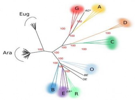 Hình 1.2. Phân loại dựa trên khoảng cách Euclide giữa tám nhóm Coffea canephora, Coffea arabica, Coffea eugenioides (Merot-L'anthoene et al., 2018 [69])