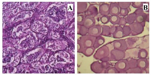 Hình 4.5 Mô tuyến sinh dục của cá trê đực ở NT đối chứng (A), (B) đặc điểm tế bào trứng của cá trê cái ở NT đối chứng (Quan sát dưới vật kính 40X)