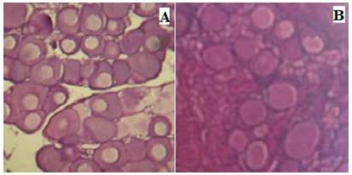 Tế bào sinh dục của cá cái ở nghiệm thức thí nghiệm khi nhuộm Aceto-carmin và quan sát dưới kính hiển vi thì phân biệt tương đối rò tế bào sinh dục của cá cái không có tác động của hormone với tế bào sinh dục của cá cái có tác động của hormone: Tế bào sinh dục cái của cá có tác động của hormone cũng có dạng tương tự các tế bào sinh dục cái bình thường của cá nhưng các tế bào này không rò nhân ở giữa hoặc màng nhân rất mờ (hình 4.6B). Còn tế bào trứng của cá ở nghiệm thức đối chứng thì nhân rất rò và có hình tròn, màng nhân cũng rất rò ràng (Hình 4.6A).