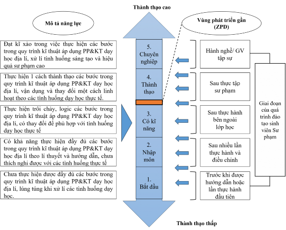 Sau thực nghiệm, kết quả chứng minh rằng: đa số SV đã vượt qua được ngưỡng của “vùng phát triển gần” để chuẩn bị cho những bước phát triển tiếp theo trong quá trình thực tập nghề nghiệp, tập sự và giảng dạy chính thức. Mức 4 – Thành thạo: Thực hiện 1 cách thành thạo các bước trong quy trình kĩ thuật áp dụng PP&KT dạy học địa lí, vận dụng và thay đổi một cách linh hoạt theo các tình huống dạy học thực tế; mức 5 – Chuyên nghiệp: Đạt kĩ xảo trong việc thực hiện các bước trong quy trình kĩ thuật áp dụng PP&KT dạy học, xử lí tình huống sáng tạo và hiệu quả sư phạm cao.