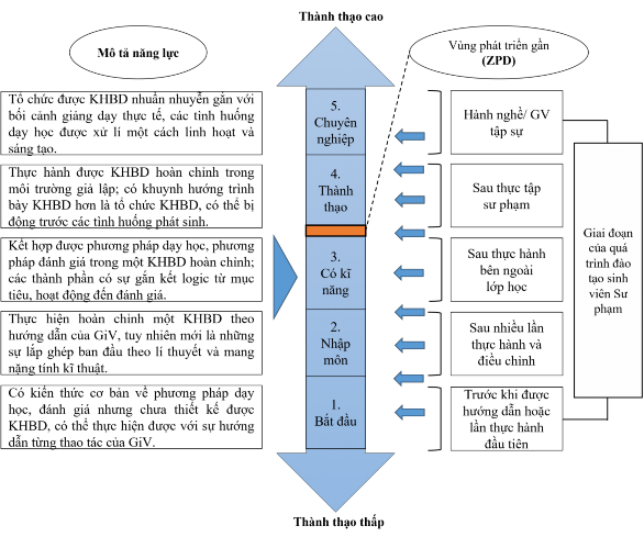 Ở giai đoạn đầu của việc phát triển năng lực thiết kế KHBD, SV đã có kiến thức cơ bản về PP&KT, kiến thức về đánh giá, tuy nhiên chưa thực hành được KHBD. Dưới sự hướng dẫn của GiV, SV bắt đầu làm quen với các thao tác cơ bản trong một khung KHBD. Như vậy, đa số SV được xếp vào mức 1 trên ĐPTNL thiết kế KHBD trong GDĐL.