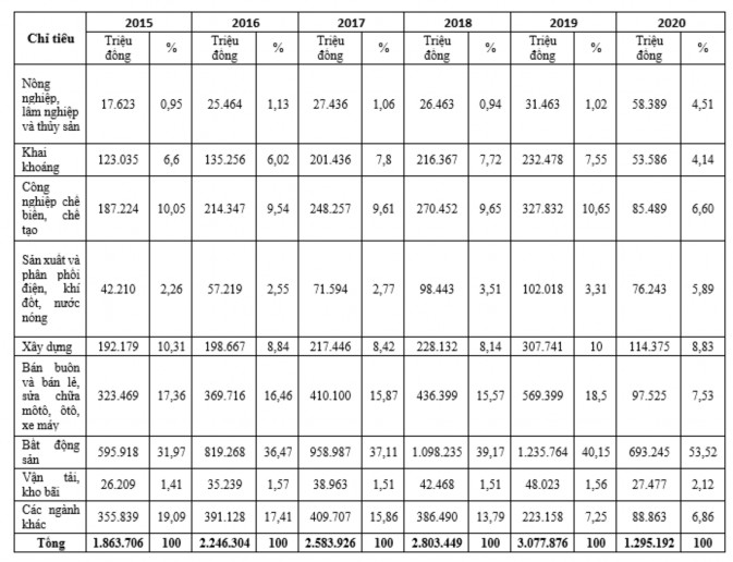 Những ngành có tỷ lệ nợ xấu cao nhất qua các trong giai đoạn 2015 - 2020 lần lượt là ngành công nghiệp chế biến, chế tạo, ngành xây dựng, ngành bán buôn và bán lẻ và lĩnh vực bất động sản. Năm 2015 các ngành nêu trên có tỷ lệ nợ xấu/ Tổng nợ xấu lần lượt là 10,05%, 10,31%, 17,36% và 31,97%. Đến năm 2019, các tỷ lệ này lần lượt là 10,65%, 10%, 18,5% và 40,15%.